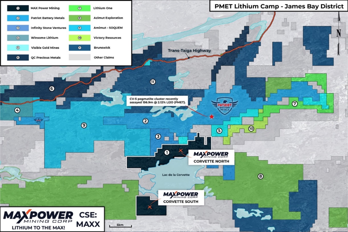 Nunavik District: MAXXF has acquired the 71 sq. mile Spark Property in the heart of the emerging New Leaf Lithium Camp in Northern Quebec’s under-explored Nunavik region, 300 miles directly north of its Corvette Lake North Property in the James Bay district. Nunavik, which hosts two operating nickel mines, is a vast area (~200,000 sq. miles) comprising approximately the top third of Quebec. Nunavik has been the focus of an initial staking rush for lithium based on rigorous reviews of historic and recent data. The data strongly support the potential for this region to host spodumene-bearing lithium pegmatite deposits, a potential discovery that could have huge implications for the development of domestic lithium supplies in the battle against China. Nunavik is above the timberline and outcrop is abundant. This will aid creative and cost-efficient exploration methods for this region that MAXXF will be deploying as it proceeds quickly to the drill stage. • Highly favorable geochemistry: The Spark Property contains a high concentration of 99th percentile lithium and cesium in lake bottom sediments, including up to 86.5 ppm lithium, based on historical assessment reports and Quebec government data (see Figure 1); • Large pegmatite structure: Historic work by SOQUEM, while searching for uranium in the late 1990’s (Assessment Report GM57402), documented a prospective structure dominated by pegmatite dykes that is approximately 2 miles long and up to 1,000 feet wide. There was no reported sampling of those dykes; • Geology: The Spark Property features a range of geology including mafic gneiss units with basaltic amphibolites. The geology is considered prospective for hosting lithium; • Geophysics: A study of magnetic surveys covering the Spark Property shows a favorable structural environment for the emplacement of pegmatites (see Figure 2); • Exploration plan: MAX will be partnering with GroundTruth Exploration to conduct an efficient first-pass sweep of the Spark Property with a quick follow-up of encouraging target areas. Crews will be highly trained for working in Nunavik, using state-of-the-art technology. The most prospective lithium targets will then be drill tested during the 2023 season; • Another Spark? MAX Power continues to review all of Nunavik for the potential acquisition of other properties with the potential to host spodumene bearing pegmatites. As lithium demand continues to explode there could be blue-sky territory growth ahead for MAXXF as it positions itself rapidly in the expanding lithium sector and builds its portfolio! MAX Power Acquires Large Claim Block Adjoining Raglan West Lithium Camp, Nunavik, Quebec MAXXF has acquired a highly strategic block of 300 claims (~50 sq. miles) adjoining the eastern boundary of the emerging Raglan West Lithium Camp in Nunavik, approximately 20 miles southwest of the community of Salluit, Quebec. Notably, these important claims were staked in early February 2023 immediately after Orford Mining kicked off a staking rush with its “Radiant Property” claims featuring abundant pegmatite dykes and unusually high lithium and cesium values in lake sediments in the 99th percentile for Quebec according to the Quebec government database. Mr. Peter Lauder, MAX Power Senior Geologist and Exploration Manager, and Member of the Order of Quebec Geologists, commented: “This acquisition of Raglan West claims next to Orford, Scout Minerals and Shawn Ryan now gives MAX a foothold in two of the three current main lithium camps in Nunavik, a vast under-explored region comprising the top third of Quebec, following our recently announced Spark Property acquisition in southern Nunavik (refer to April 21, 2023 news release).” James Bay DistrictMAX Power has purchased a 100% interest in two under-explored large claim blocks (Corvette Lake North and Corvette Lake South) in close proximity to Patriot Battery Metals’ (PMET) world class Corvette discovery in the James Bay District of northern Quebec. Highlights: • Historical reports, government data and very recent reconnaissance have documented pegmatite occurrences on Corvette Lake North, just 2 miles south of PMET’s CV5 pegmatite discovery where recent drilling returned 156.9 meters at 2.12% Li 2 O (drill hole CV22-083) as reported by PMET January 20, 2023; • A large prospective area spanning 9,709 hectares over 189 mineral claims; • MAX Power is preparing a two-phase 2023 exploration program at its Corvette Camp properties with details to be announced soon; Property Location Map and Bedrock Geology: The properties are both situated along the shores of Corvette Lake and located in the La Grande geological sub-province. The rocks are generally Archaean in age. The MAX Power claims are underlain by 12.5 miles of strike length of underexplored intrusive and sedimentary rocks. Corvette North has seen minor historical mineral exploration, primarily for gold. Historical reports and government data document pegmatite occurrences on Corvette North. This same historical work suggests pegmatites can occur within a variety of rock types. *Management cautions that mineralization hosted on adjacent and/or nearby properties is not necessarily indicative of mineralization hosted on MAX Power’s properties. ![]() United StatesMAXXF has acquired a district scale opportunity targeting lithium-rich brines and/or claystones in the ~50 sq. mile Willcox Playa in Cochise County, Arizona, approximately 200 miles southeast of Phoenix. Highlights: • The U.S. Geological Survey (USGS), after completing some limited drilling at the Willcox Playa in the 1970’s, historically referenced this area as one of the most prospective locations for lithium in the Western United States, similar in its potential to Clayton Valley, Nevada, and the lithium brine and claystone deposits that have been identified there; • Decades of U.S. Air Force activity in the Willcox Playa has ended, with MAX benefiting from first-mo